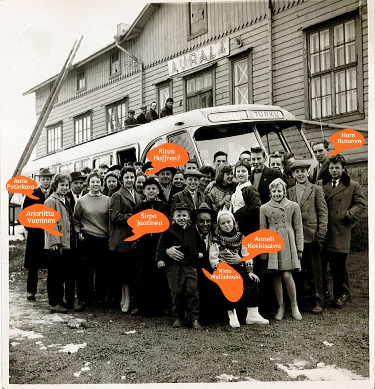 Eikä tässä kaikki! Sirpa Jaatinen (os. Hietaniemi) toi kuva-arvoituksen ratkomiseen lisää syvyyttä kertomalla kuvan liittyvän vuoteen 1955, jolloin hän ja muut kuvassa olevat henkilöt matkustivat Göteborgiin. Matka oli jännittävä 15-vuotiaalle Sirpalle. Hän kertoi, että ennen laivalle lähtöä seurue oli pysähtynyt Konserttitalon edessä olevan veistoksen luona. Veistos on kaksoiskappale Göteborgille lahjoitetusta veistoksesta. Veistos on nimeltään ”Kun ystävyyssuhteet solmitaan” ja sen on tehnyt Wäinö Aaltonen. Sirpa on osallistunut Auralan Setlementin toimintaan 12-vuotiaasta lähtien. Ensin erilaissa kerhoissa ja sen jälkeen pienten kerhonvetäjänä. Myöhemmin Sirpa osallistui kansalaisopiston englannin ja tietotekniikan kursseille.