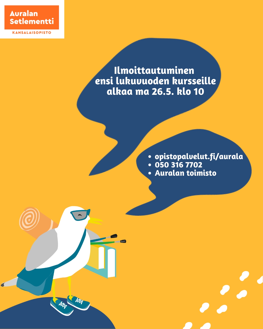 Odotettu hetki on pian täällä – Auralan kansalaisopiston syksyn 2025 kurssi-ilmoittautuminen käynnistyy maanantaina 26.5.2025 klo 10.00! Tutustu monipuoliseen kurssitarjontaamme ja löydä itsellesi sopivaa tekemistä, oppimisen iloa ja uusia elämyksiä.