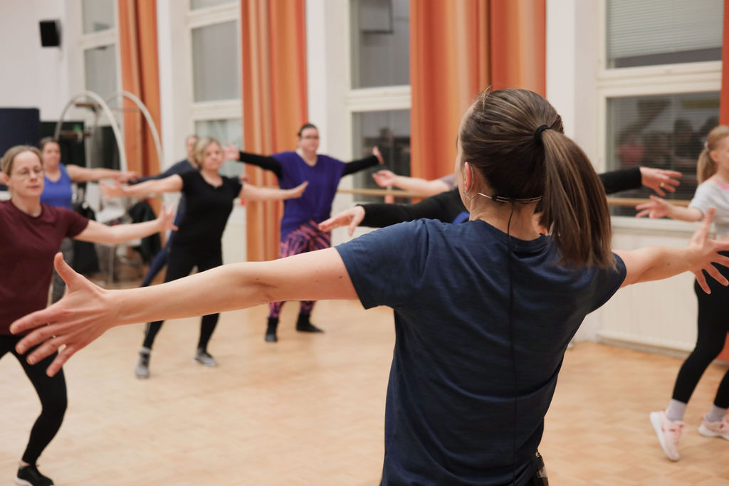 ryhmäliikuntatunti Auralan juhlasalissa