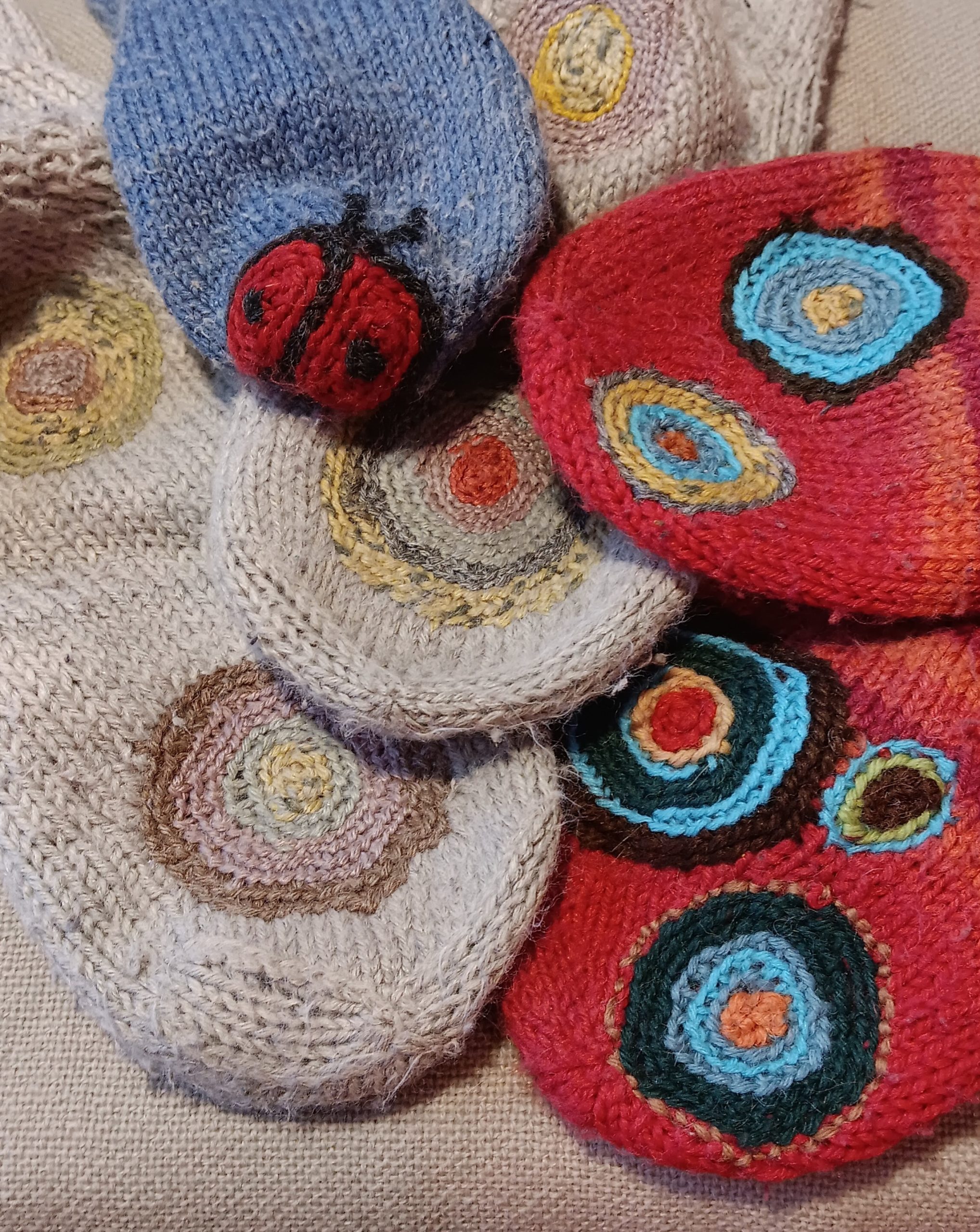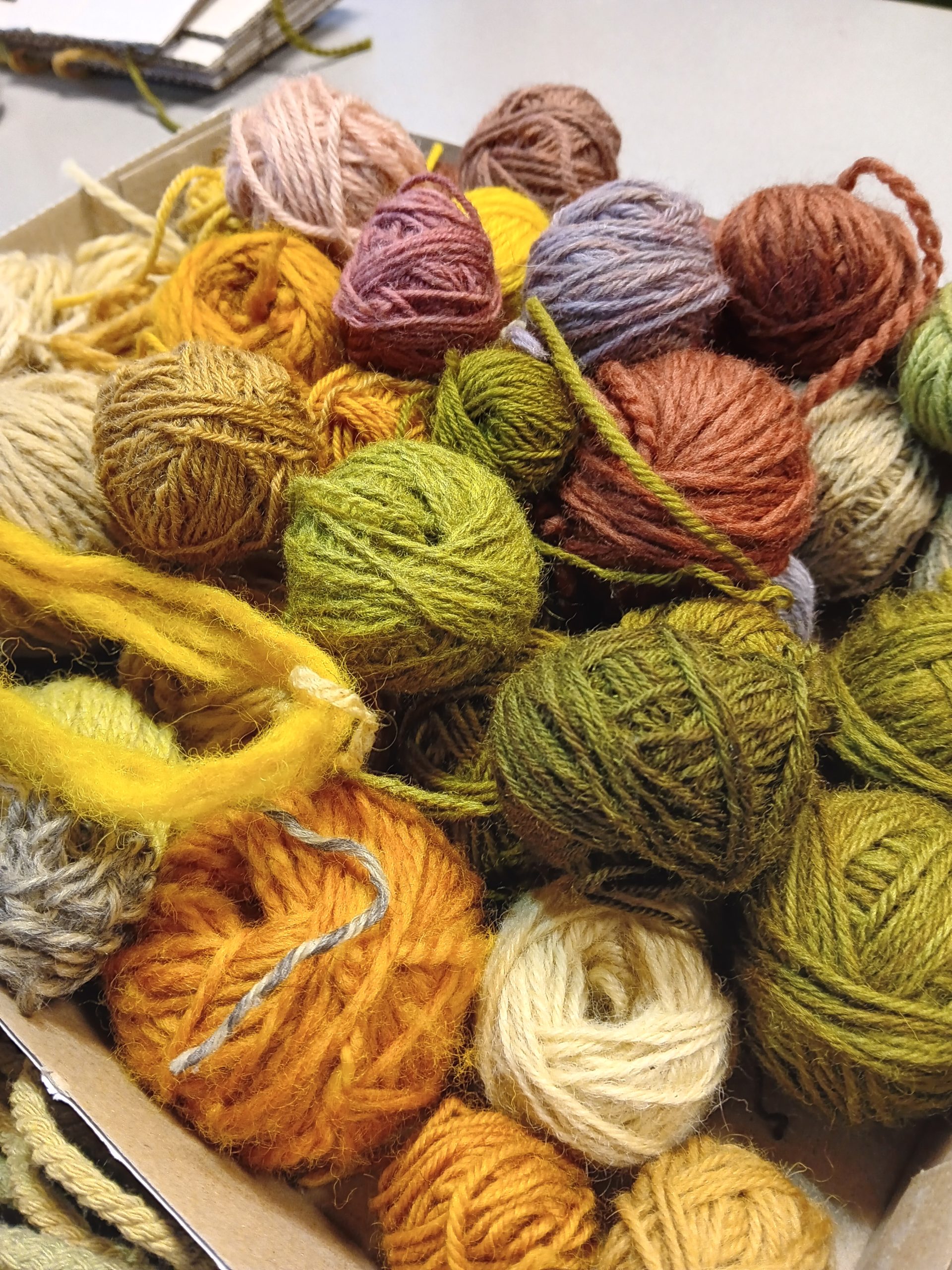 Hyviä mieleenpainuvia hetkiä on aina, kun opetellaan ja oivalletaan uutta, mutta eräs oikein koskettava hetki sattui nyt talvella värjäyskurssilla, kun ryhmän kanssa kerimme värjättyjä lankoja ja muistelimme, mistä mikäkin sävy oli lankaan saatu. Eräs ryhmäläinen oli talven mittaan joutunut elämässään käsittelemään isoa luopumista, ja hän kertoi, että erilaisista kävyistä oli hänelle tullut jotenkin sen surullisen kauden symboli – hän bongaili käpyjä niin kävelyretkillä kuin muutenkin, esimerkiksi kauniita kuvia erilaisista kävyistä osui silmiin vähän joka puolella. Tällä kurssilla oli tullut tutuksi lepän käpy, josta saimme upeaa vahvaa oranssinruskeaa sävyä. Varmaankin meillä kaikilla siinä pöydän ympärillä oli kyynel silmäkulmassa, kun hän suunnitteli, miten ottaa nyt tämän ihanan värin (ja hyvät muistot siitä, miten kävyt kerättiin ja langat yhdessä värjättiin) surullisenkin muistonsa osaksi, liittää langan raidaksi tekeillä olevaan käsityöhönsä, ja on sitten taas hiukan valmiimpi jatkamaan surullisesta kokemuksestaan elämässä eteenpäin. Luonnonmateriaalit ja käsillä tekeminen antavat aina iloa elämään, mutta lisäksi niiden avulla voi työstää hyvin raskaitakin kokemuksia ja muistoja.