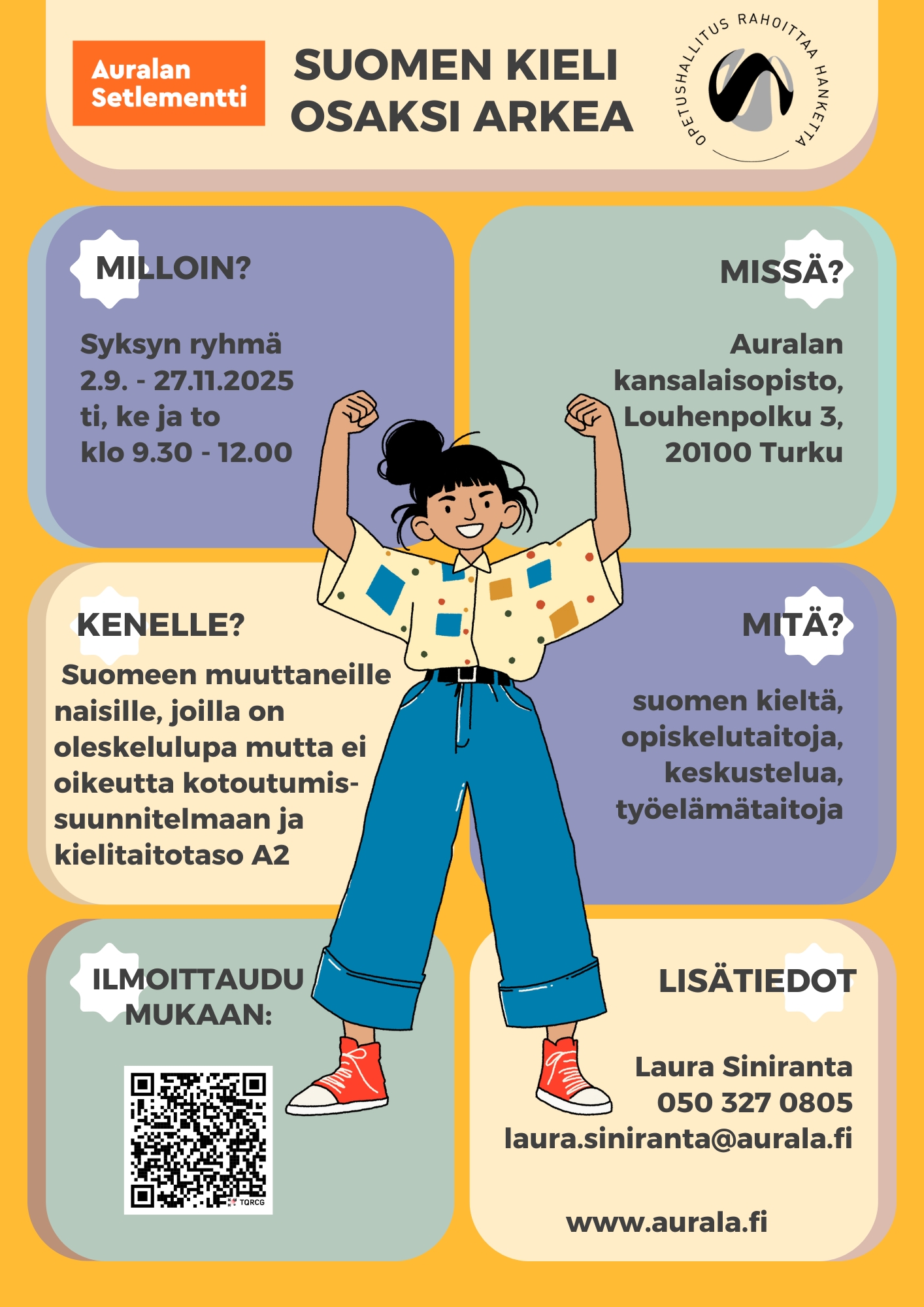 I höstas startade ett nytt projekt riktat till invandrarkvinnor i Aurala, som syftar till att göra finskainlärningen till en mer integrerad del av språkinlärarnas vardag. Projektet syftar till att både ge finsk språkträning och hjälpa dem att hitta möjligheter i sin egen lokala miljö att stärka och utveckla sina språkkunskaper.